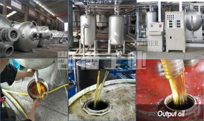 (E)我公司專業化學催化劑、添加劑,既使廢油在常壓下加熱到400℃也不會有明顯的裂化產生。如;在常壓下,沒有加入催化劑的廢油在300℃的時候就開始碳化結焦,即對回收的油品質量明顯下降,并回收率也明顯的降低。因廢機油里的膠質,瀝青,游離碳等雜質非常多,可以有效的防止這些物質結焦,對設備長期使用有效保障的同時提高廢油回收產量。
